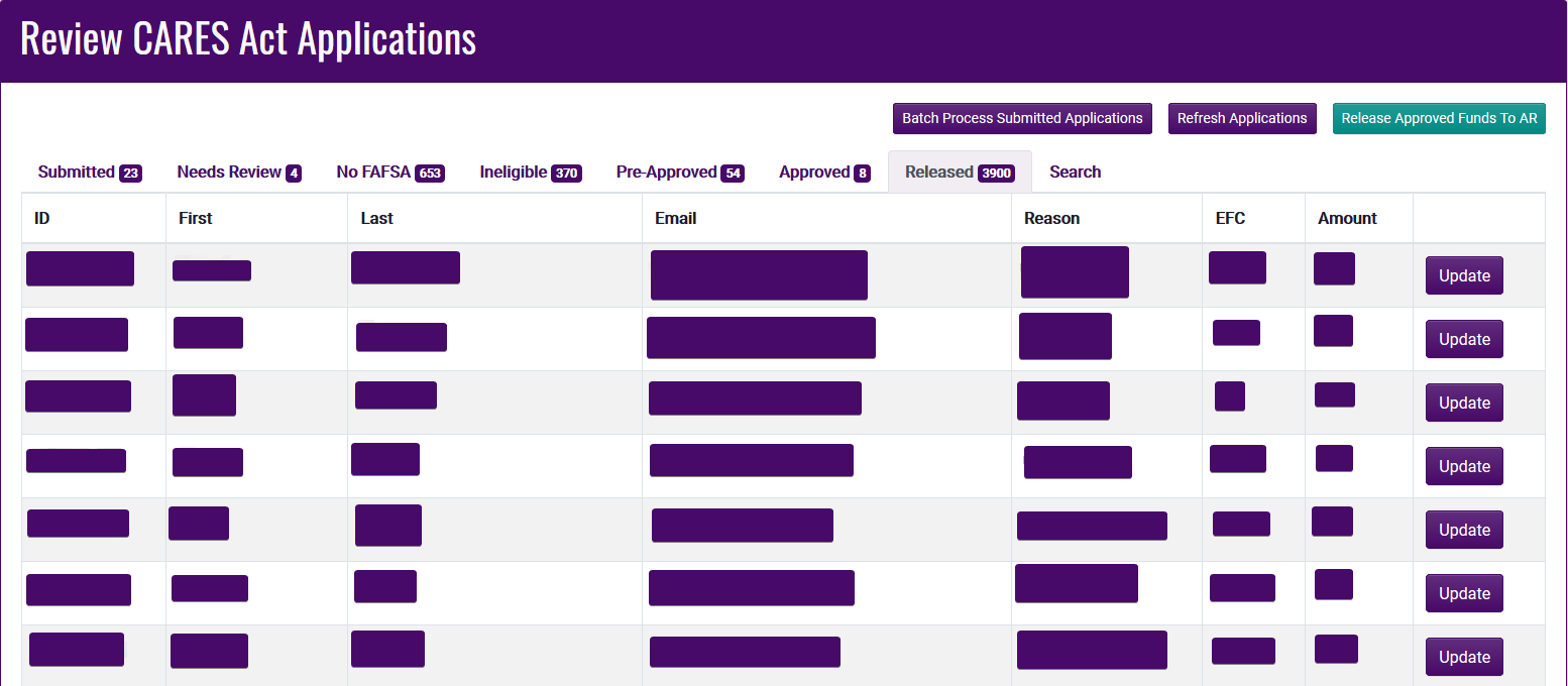 As part of the CARES Act, Florida schools recieved around $4,000,000 to aid students who were financially impacted by the COVID-19 pandemic. The Office of Financial Aid requested IT's assistance to get the funds in the hands of students as soon as possible.In roughly a week, we created an automatically populated form for the students, a RESTful API for the form submissions, and a small React dashboard to display that data.On the dashboard, Financial Aid employees can batch process the submitted applications, review the applications that failed some prerequisite conditions, manually adjust an application's status or cash award, and forward the approved applications to Accounts Recieveable to disburse the funds.